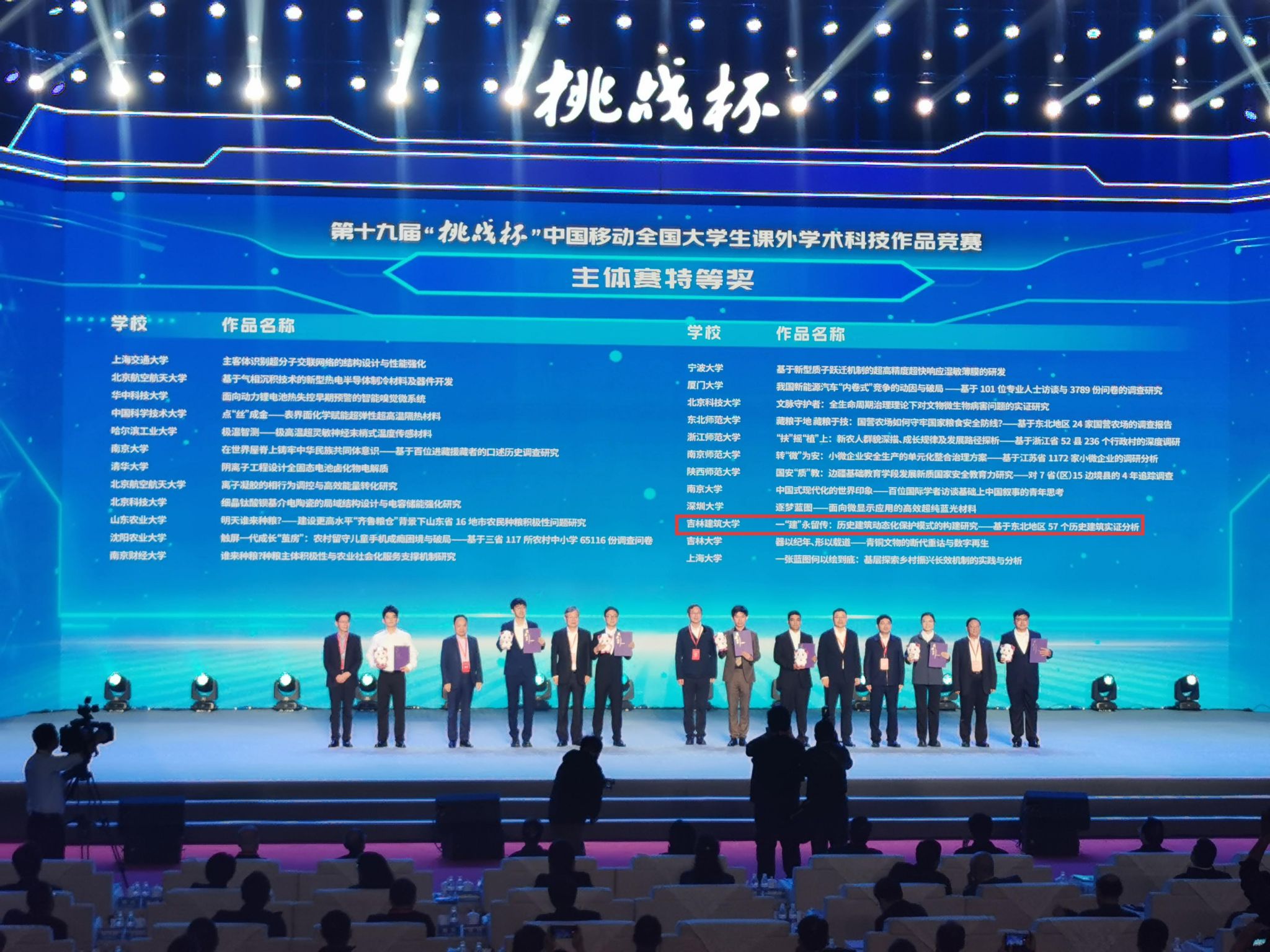 获奖项目中,《一“建”永留传:历史建筑动态化保护模式的构建研究——基于东北地区57个历史建筑实证分析》项目荣获主体赛国家级特等奖,《“双废锁毒”——基于梯度晶化技术的油页岩渣/粉煤灰生态环保微晶玻璃》项目荣获主体赛国家级二等奖。这一成绩的取得,实现了学校自1989年首届“挑战杯”竞赛举办以来在该项赛事最高奖项上“零”的突破,创造了学校参赛历史上的最佳成绩。
