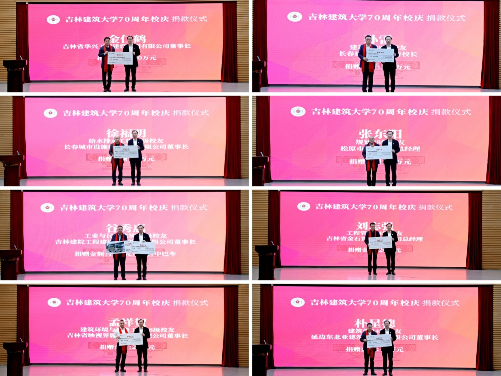 本次捐赠仪式上,有10家单位和个人向学校慷慨捐赠款物合计490万元。其中,吉林省华兴工程建设集团有限公司董事长金仁鹤捐赠200万元,长春建筑学院董事长孙爱东捐赠100万元,长春城市设施建设集团股份公司董事长徐福明捐赠50万元,松原市博润集团总经理张东阳捐赠30万元,吉林建院工程建设监理咨询有限公司董事长谷秀惠捐赠财物30万元,白山市业之兴门窗工程有限公司总经理赵双军捐赠20万元,吉林省金石置业有限公司总经理刘志强捐赠20万元,吉林省映视界影视投资有限公司董事长孟祥贺捐赠20万元,延边东北亚建筑设计院有限公司董事长朴星德捐赠10万元,吉林省政源实业有限公司总经理阚敬吉捐赠10万元,鼎力支持学校教育事业发展。
