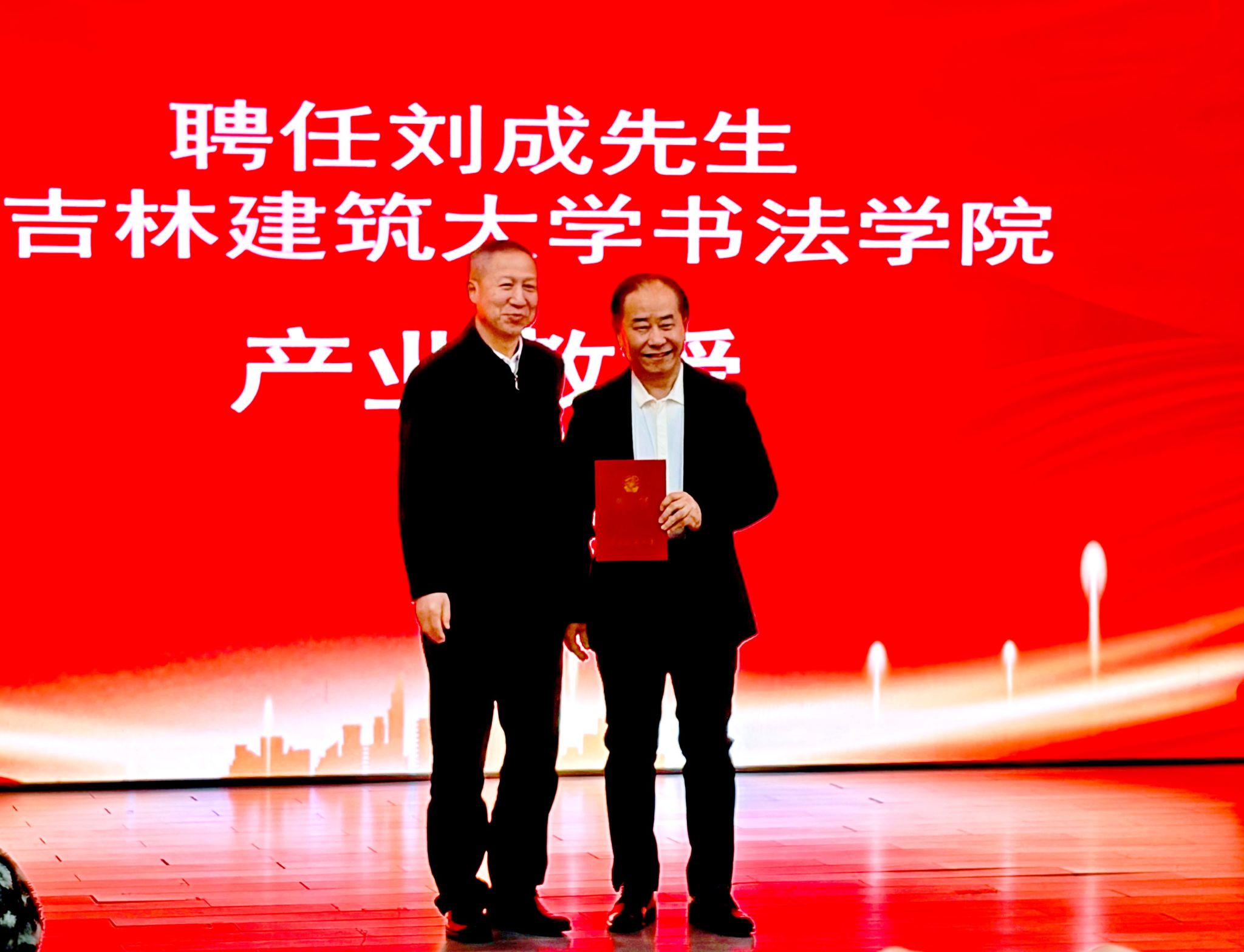 聘任仪式上宣读了《吉林建筑大学关于公布学校第二批产业教授名单的通知》,李雁冰为刘成颁发产业教授聘任证书。