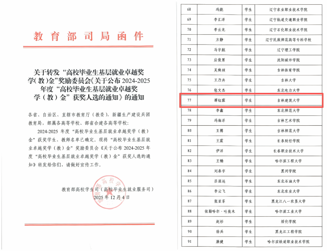 近日,教育部公布2024-2025年度“高校毕业生基层就业卓越奖学(教)金”获奖名单,学校土木工程学院2018届毕业生谭钰霖光荣入选,荣获“高校毕业生基层就业卓越奖学金”,这是学校毕业生首次获此殊荣。