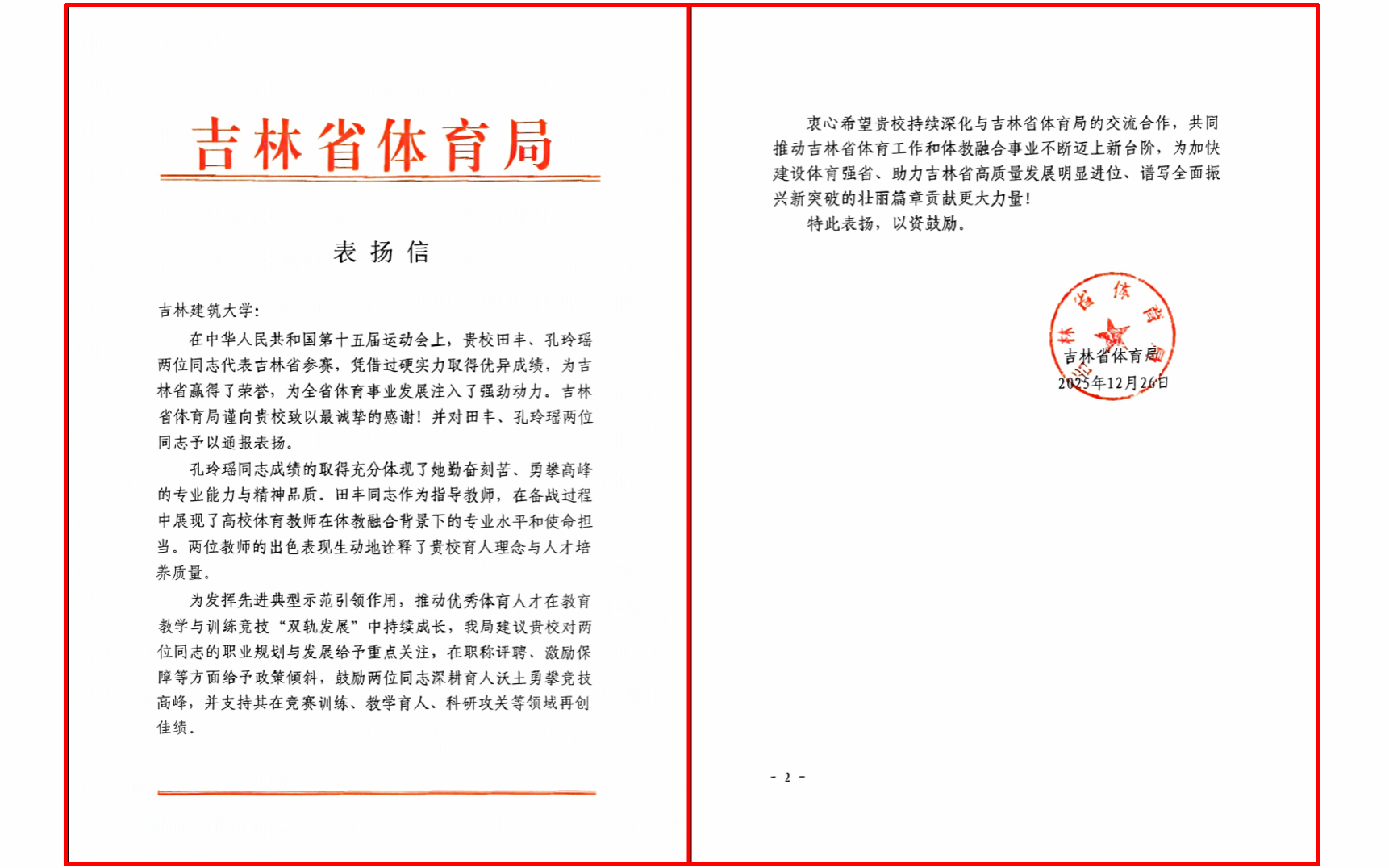 近日,学校收到来自吉林省体育局的表扬信,信中对学校体育部教师田丰、孔玲瑶在中华人民共和国第十五届运动会上取得的优异成绩予以表扬,并对学校给予高度肯定。