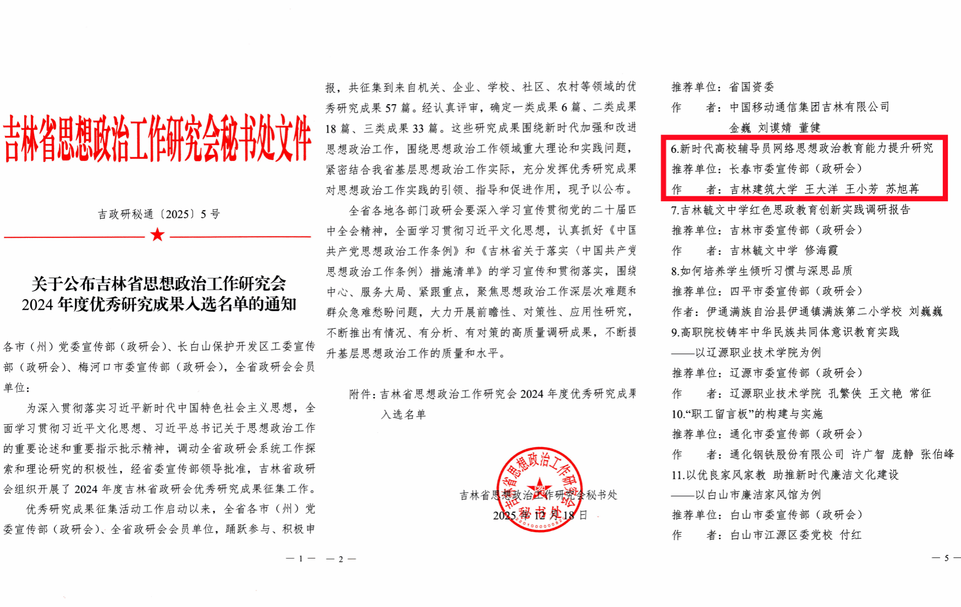 近日,吉林省思想政治工作研究会公布了2024年度优秀研究成果入选名单,学校教师王大洋、王小芳、苏旭苒申报的《新时代高校辅导员网络思想政治教育能力提升研究》获评二类研究成果。